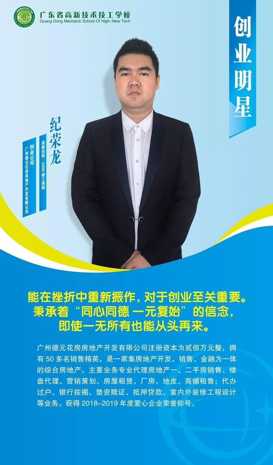 廣東省高新技術(shù)技工學校涌現(xiàn)出一大批創(chuàng)新創(chuàng)業(yè)的優(yōu)秀校友,今天我們先展示出第一批--10位創(chuàng)業(yè)“明星”,他們不畏艱辛和困難,在創(chuàng)業(yè)路上努力拼搏。