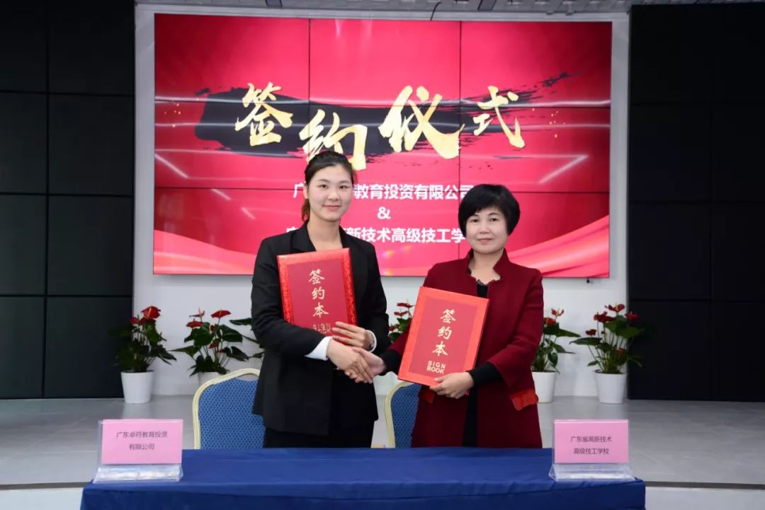 廣東卓符教育投資有限公司蓓蕾實(shí)驗(yàn)幼兒園園領(lǐng)導(dǎo)游堯與廣東省高新技術(shù)高級技工學(xué)校執(zhí)行校長肖中圓簽定合作協(xié)議。