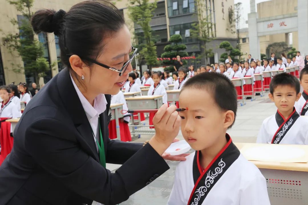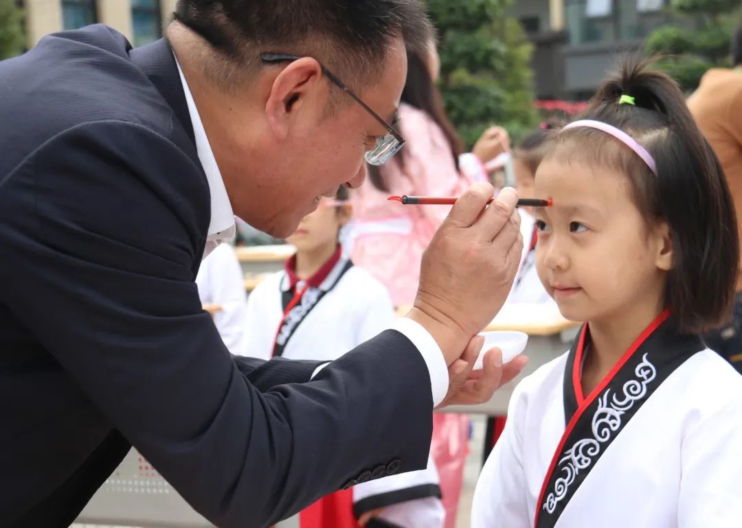 第二項(xiàng)由尹校長(zhǎng)、徐校長(zhǎng)帶領(lǐng)老師們給孩子們“啟智” ,一起將鮮紅的朱砂,在孩子們的額頭正中點(diǎn)痣,為他們開(kāi)天眼。一顆顆紅痣在額上閃耀,飽含父母、長(zhǎng)輩、學(xué)校的美好祝愿,在孩了們心中勾畫(huà)起一道道亮麗的風(fēng)景。