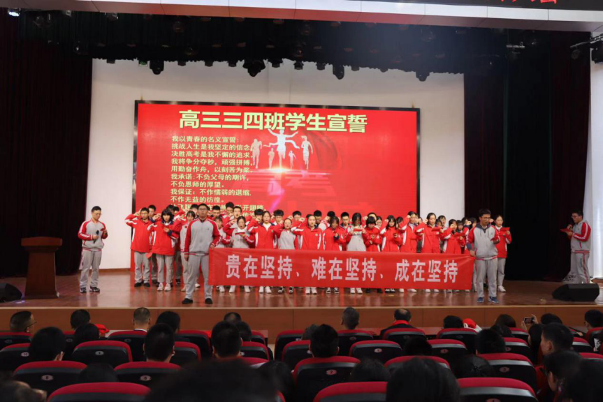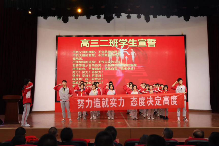 各班學(xué)生分別宣誓 高三年級(jí)的四個(gè)班級(jí)逐一上臺(tái),為全體師生展現(xiàn)本班的風(fēng)采。“同闖崢嶸十春秋,共創(chuàng)輝煌佳年華”“努力造就實(shí)力,態(tài)度決定高度”“貴在堅(jiān)持、難在堅(jiān)持、成在堅(jiān)持”,聽(tīng)啊,這就是高三學(xué)子的聲音,更是高三學(xué)子面對(duì)高考大關(guān)的無(wú)盡信心。