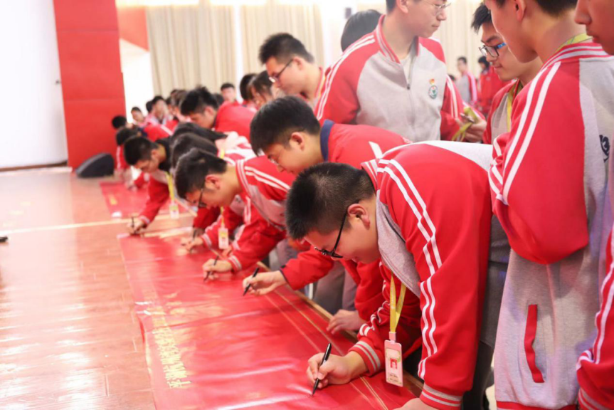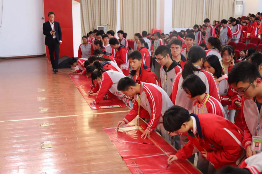 各班學(xué)生分別到臺(tái)前簽名,表達(dá)自己的雄心壯志,堅(jiān)持砥礪前行。一個(gè)個(gè)形各異卻志相同的名字仿佛在無(wú)聲地宣告同學(xué)們必定將努力落實(shí)在行動(dòng)上的決心。