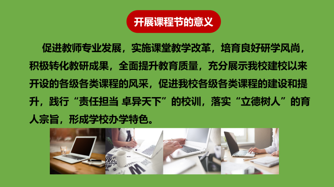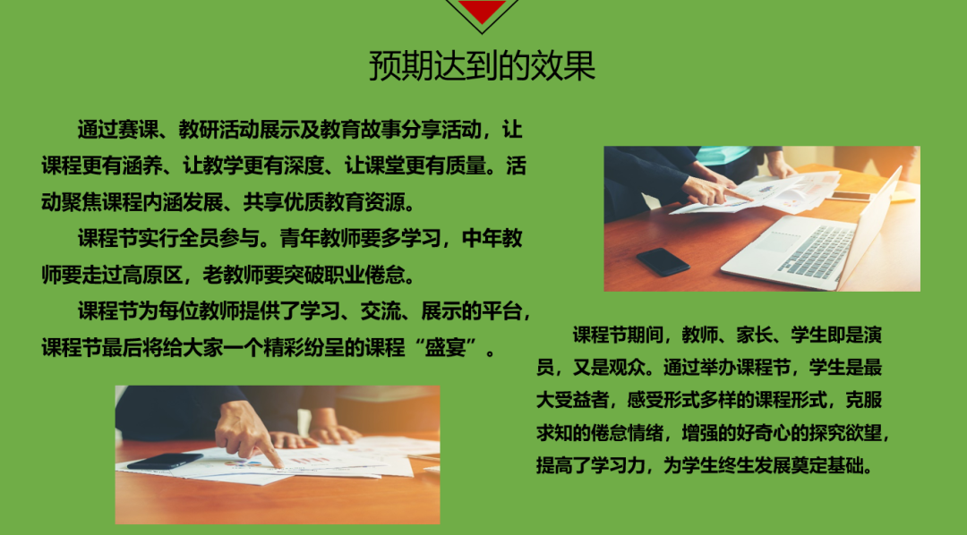 吳燕校長首先從課程節(jié)的意義出發(fā),讓大家明確了課程節(jié)開展的重要意義。然后從國家級課程展示、地方課程展示及校本課程展示、大課堂展示、優(yōu)秀教研活動展示、班主任班會課比賽、家長講堂、優(yōu)秀校本課程匯展及匯演等七個方面進(jìn)行了具體的闡述,讓大家找到了落實的方向。最后吳燕校長對本次課程節(jié)的圓滿進(jìn)行表達(dá)了衷心的祝愿和滿滿的期待。她表示:本次課程節(jié)為每位教師提供了學(xué)習(xí)、交流、展示的平臺,最后將給大家一個精彩紛呈的課程“盛宴”。課程節(jié)期間,教師、家長、學(xué)生即是演員,又是觀眾。通過舉辦課程節(jié),學(xué)生是最大受益者,感受形式多樣的課程形式,克服求知的倦怠情緒,增強(qiáng)的好奇心的探究欲望,提高了學(xué)習(xí)力,為學(xué)生終生發(fā)展奠定基礎(chǔ)。