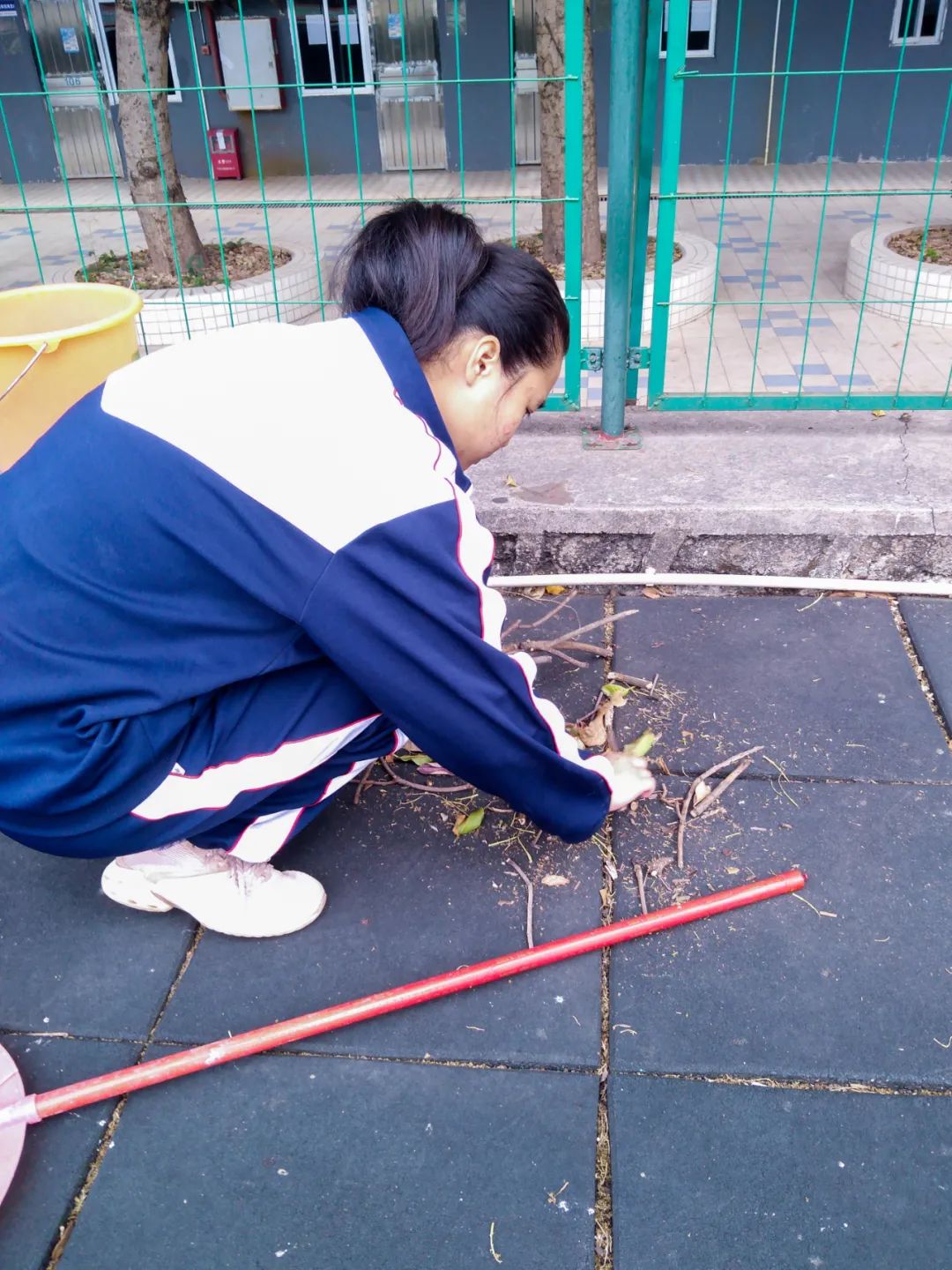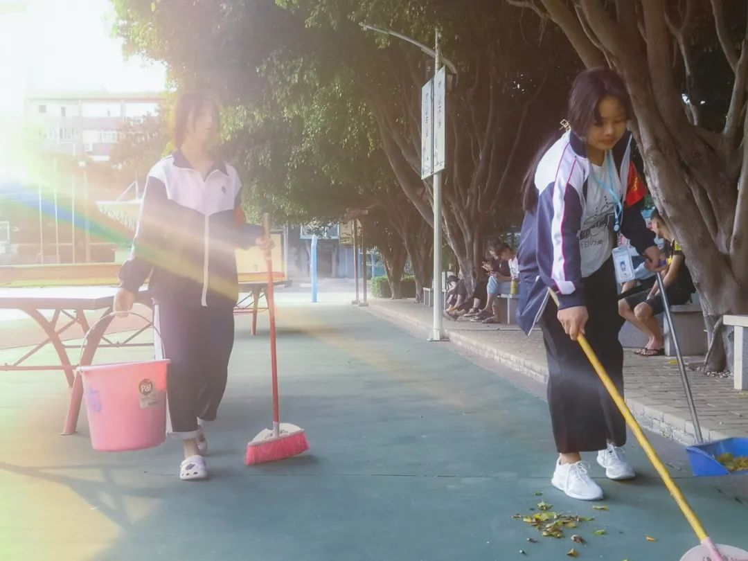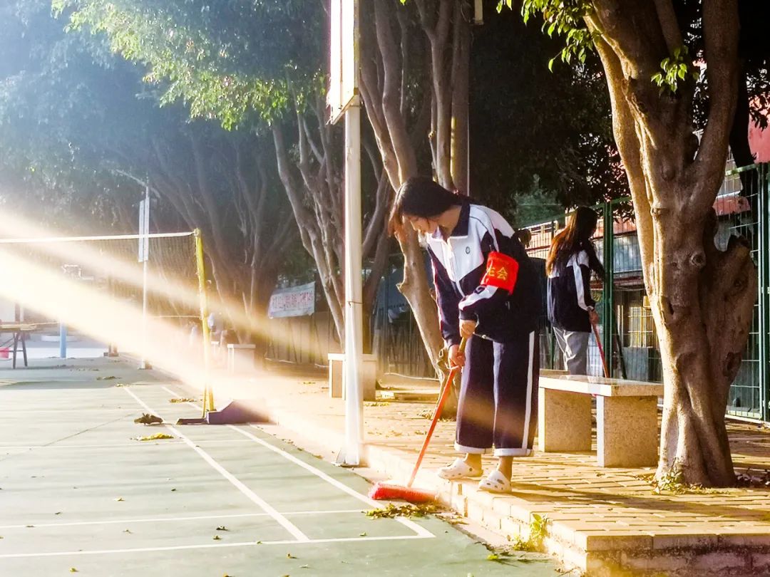 清晨,志愿者在陽光下打掃校園