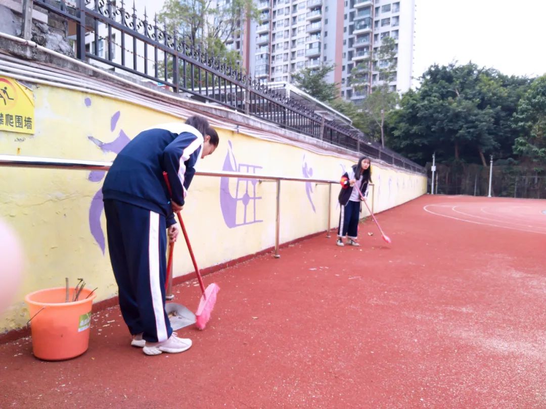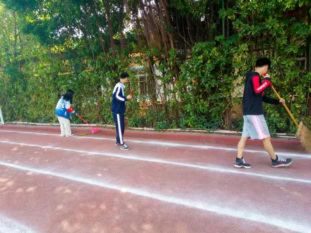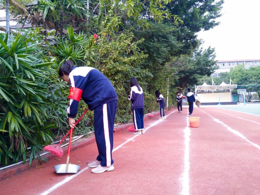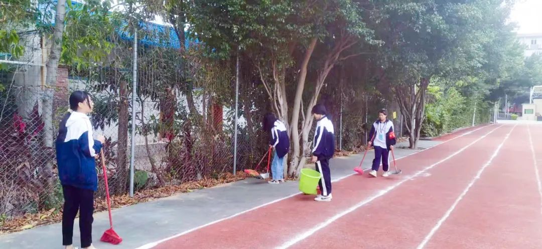 提前到達(dá)操場的是王廷榮、黃詩文、李仁懷、李燦彬、溫善媛等同學(xué)。他們揮動著掃把便開始“沙沙”地清掃落葉,掃地的聲音好像鳥兒在對他們唱歌,又像是在鼓勵他們:“勞動的孩子最美麗”。